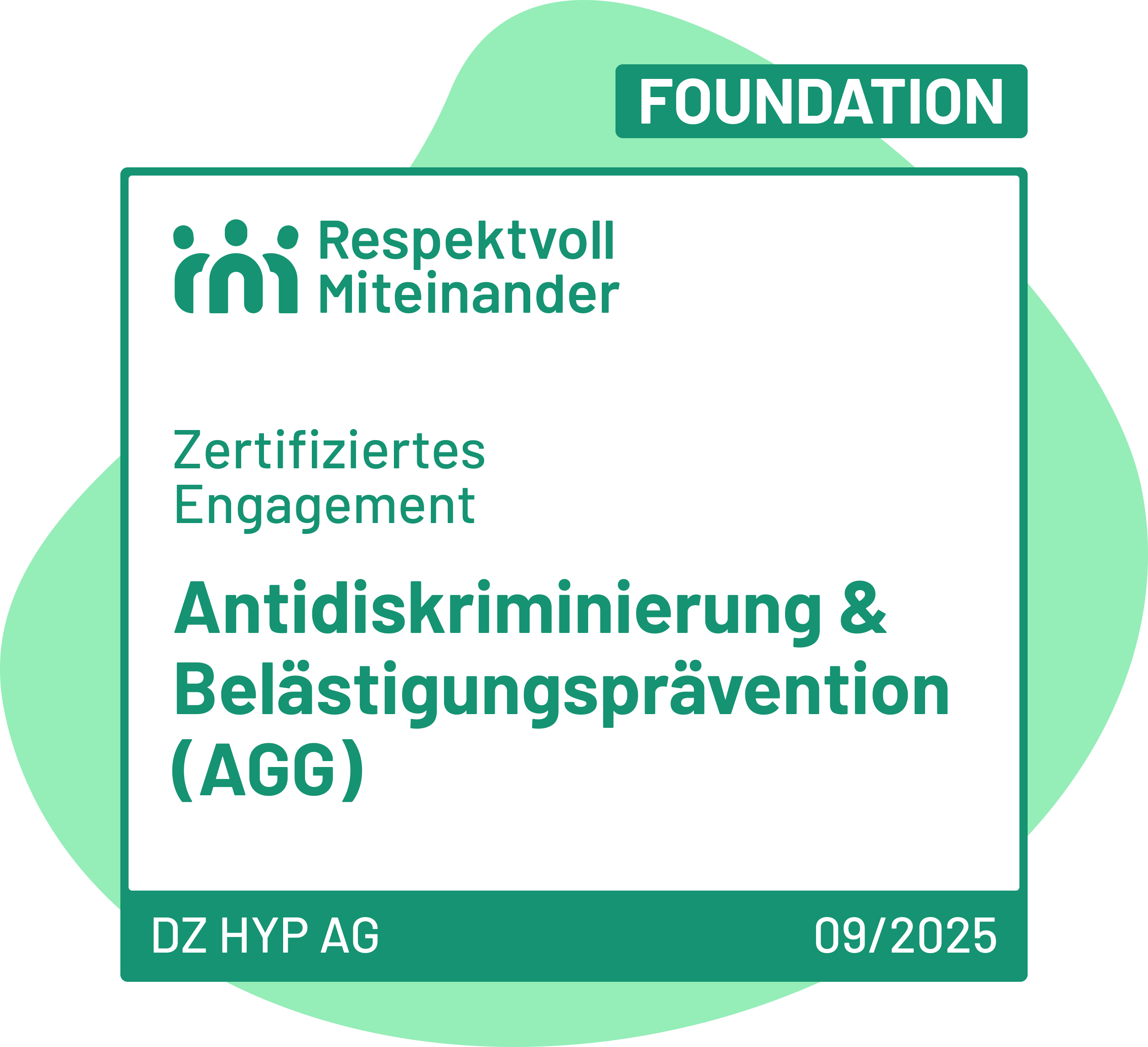 Mit dem erfolgreichen Abschluss der Respektvoll-Miteinander-Zertifizierung zeigt DZ HYP AG, dass diskriminierungsfreies Handeln, Verantwortung und kontinuierliches Lernen fest in der Unternehmenskultur verankert sind.